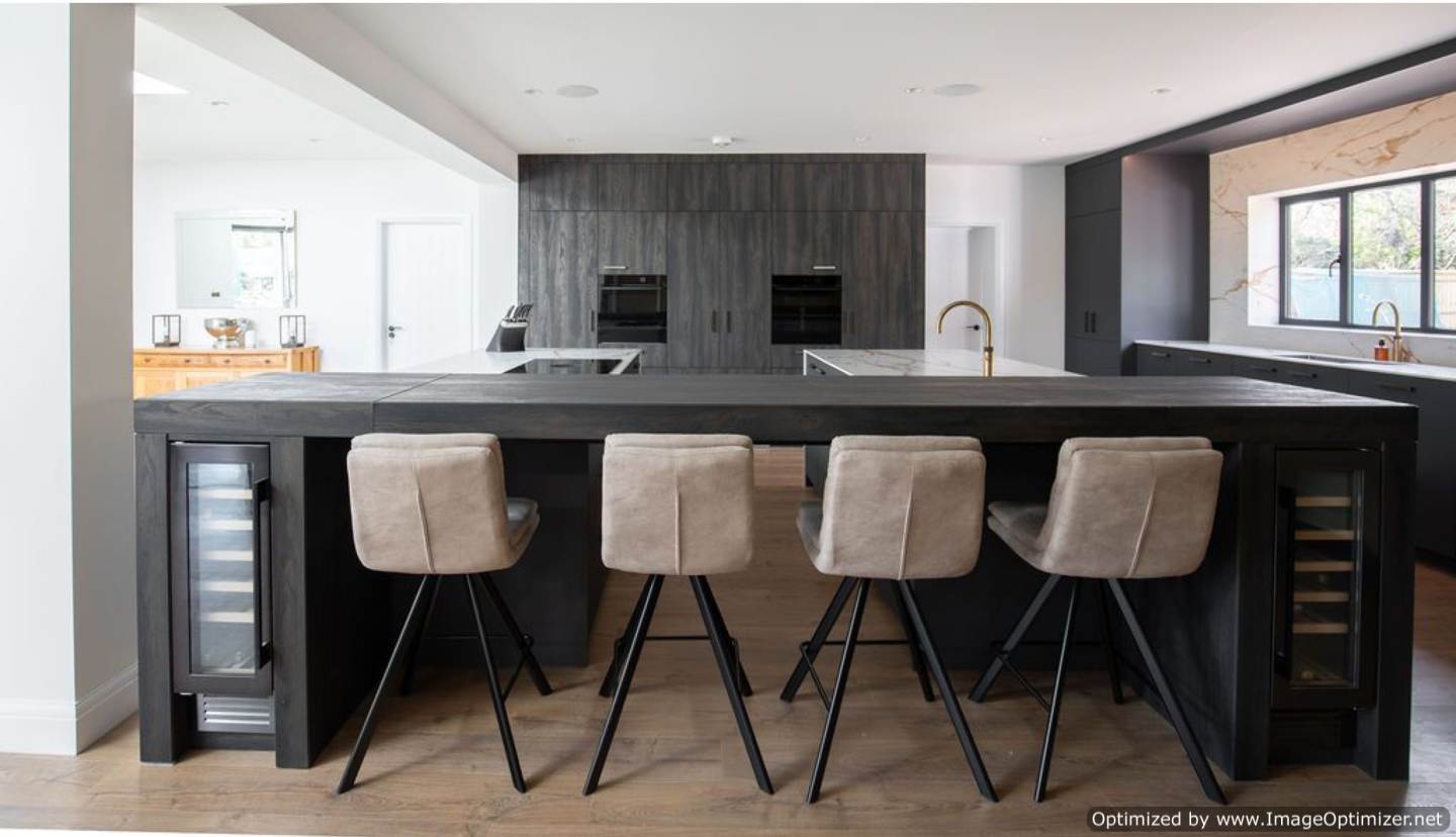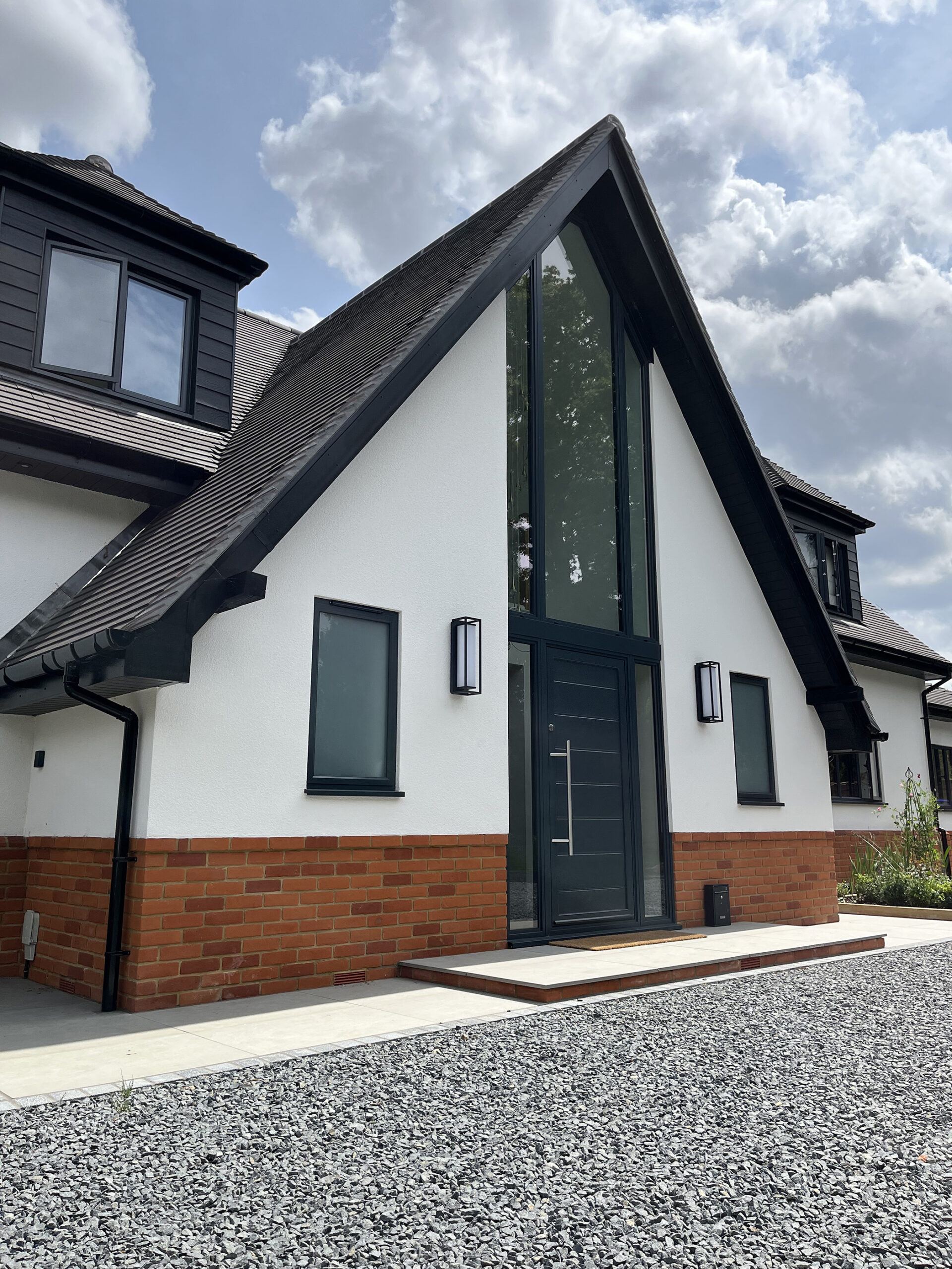 A new main entrance establishes a bold architectural focal point, leading into a dramatic double-height interior that enhances light, space, and arrival experience. To the rear, the extensions open seamlessly onto the landscaped gardens and outdoor kitchen, creating a strong connection between inside and out.