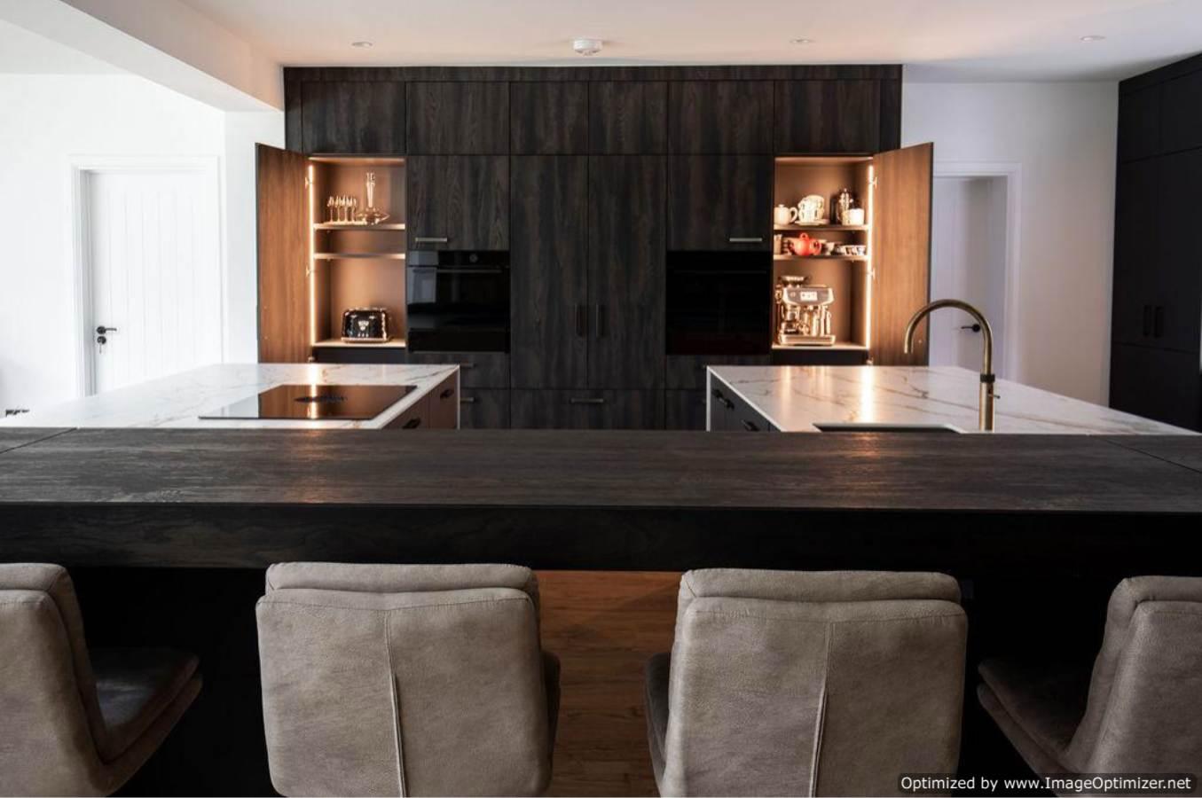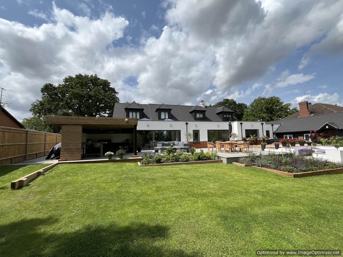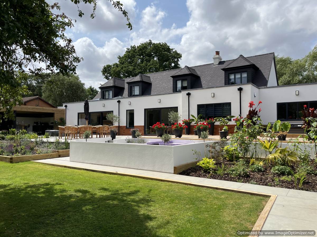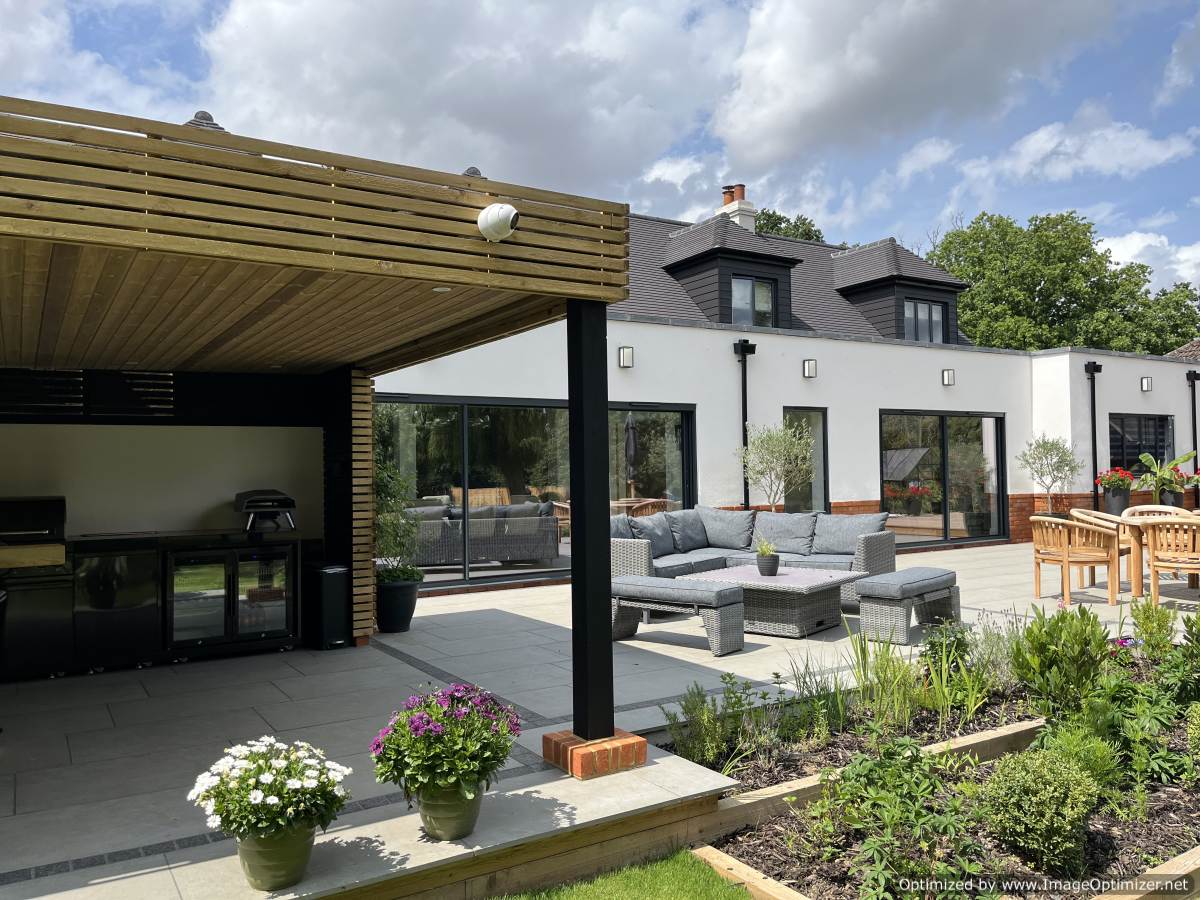 The external spaces are designed for contemporary living and entertaining, incorporating a bespoke outdoor kitchen and a sunken seating area that anchors the garden layout.